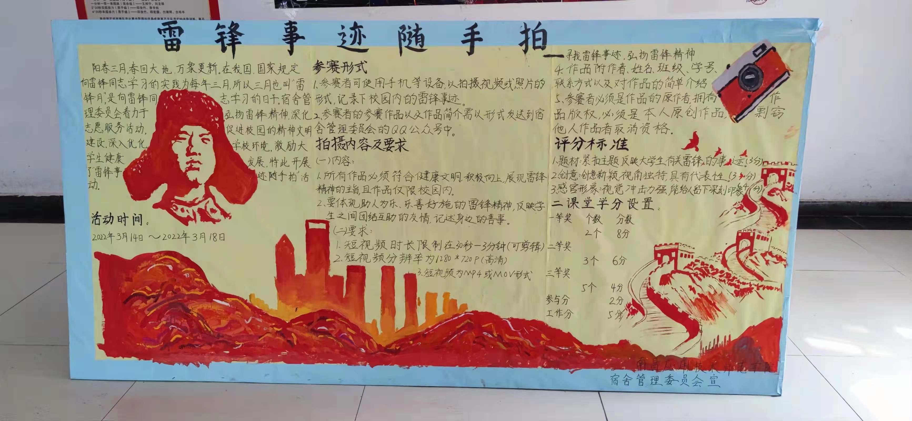 在疫情期间,学生工作处积极组织广大学生团体践行雷锋精神,利用“学雷锋”主题月活动,发动我校青年学子利用手机、相机将校园身边发生的“雷锋行为”记录下来,并书写“三行情诗”向雷锋同志致敬。
