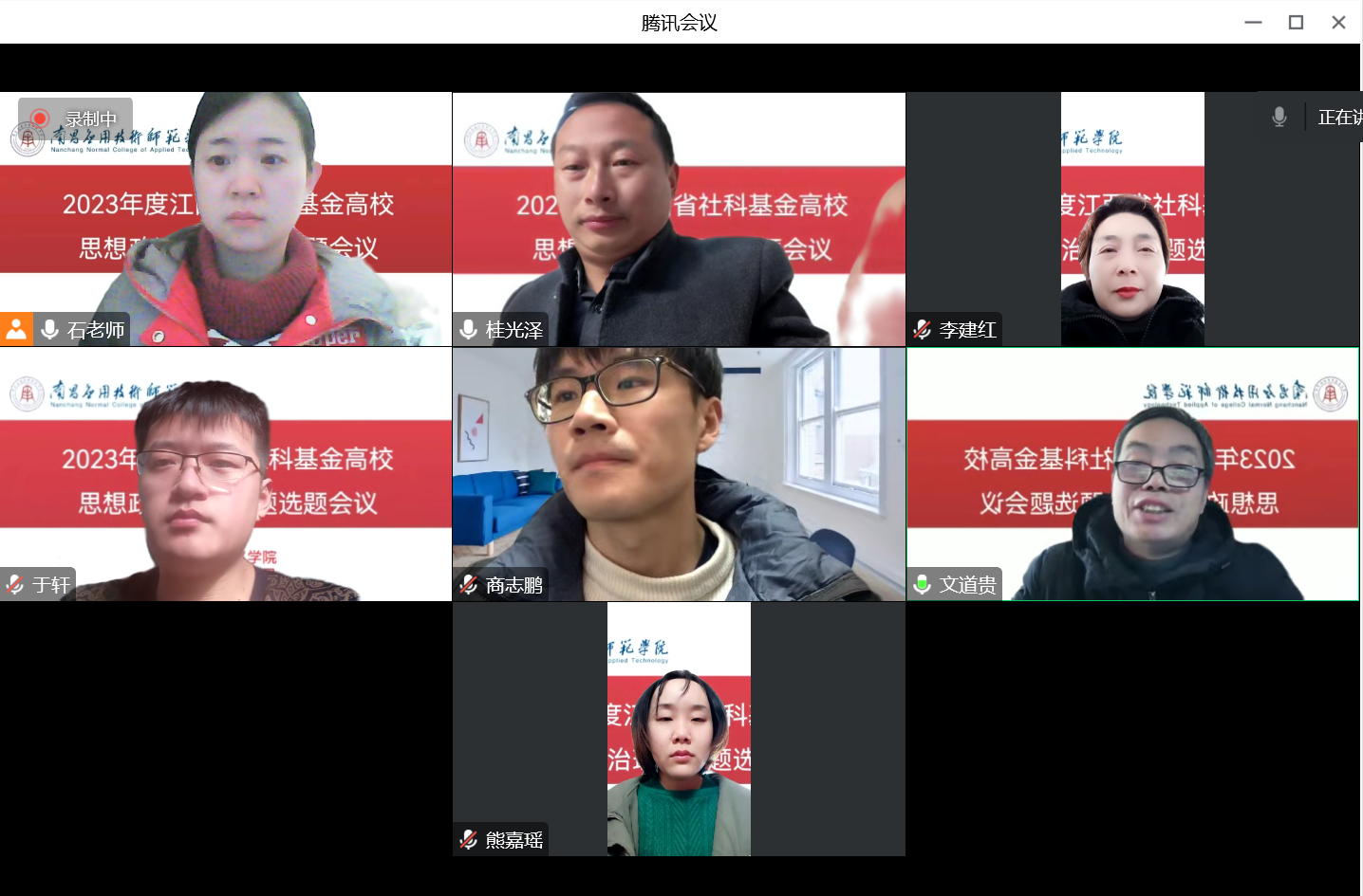 2023年1月20日,yl6809永利官网yl6809永利官网召开课题申报线上会议,永利官网按照课题申报通知及学校党委指示,认真学习和研究江西省社会科学界联合会、江西省教育厅《关于组织开展2022年度江西省社科基金高校思想政治理论研究专项申报工作的通知》,积极组织永利官网思政专职教师参加专项申报工作。会议由党总支副书记桂光泽主持,院长文道贵、思政教研室6位申报课题的专职教师参会。