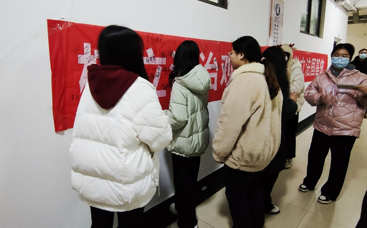 (图为同学们在宣传标语上签字)