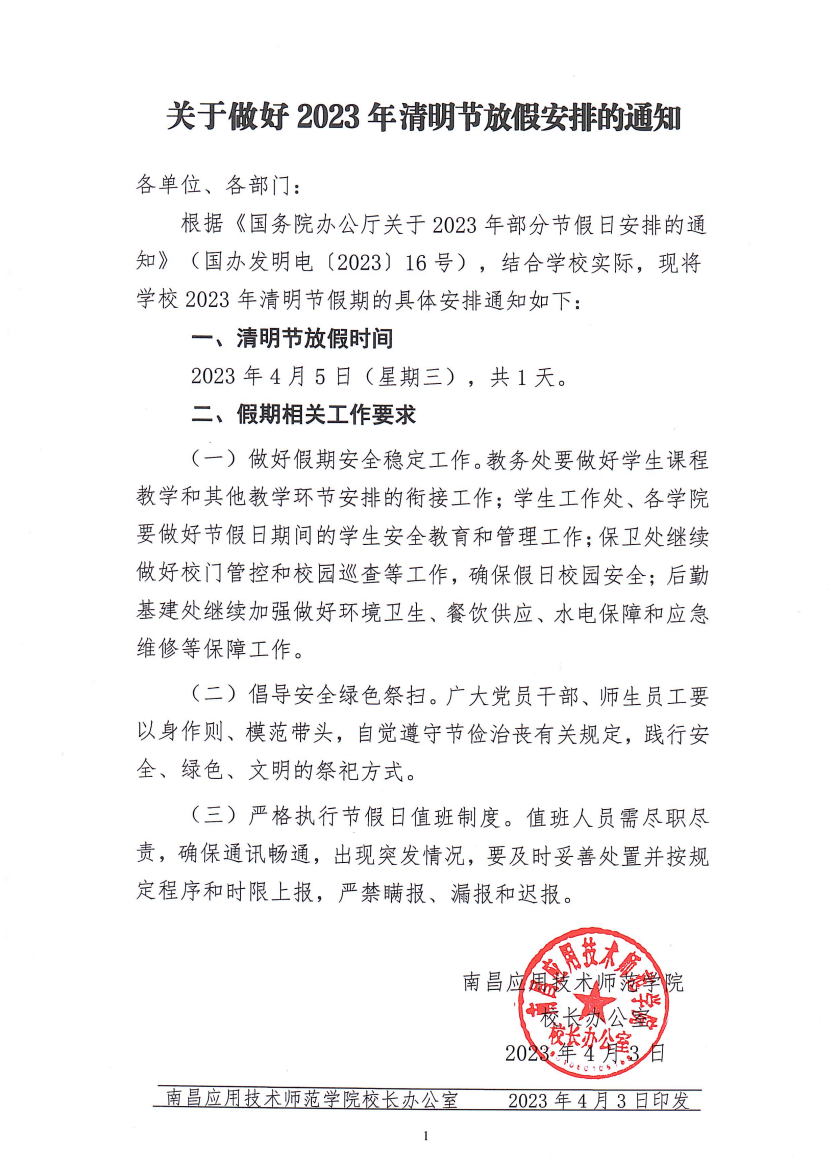 教学管理 学院新闻 学院公告 学院相册 您现在的位置是:首页 > 教学管理 > 学院公告 关于做好 2023 年清明节放假安排的通知 管理员2023-04-041158 上一篇 关于将朱子健等13位同志进行入党积极分子备案的报告