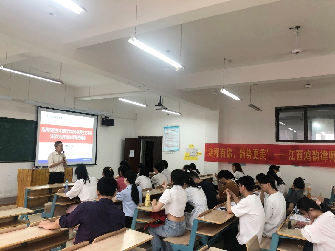 就业是民生之本,是经济发展的基石。为促进永利官网毕业生更好就业,2023年5月17日下午4点半,学院在教学楼3307教室,组织了法学专业毕业生专场招聘会,招聘方为江西鸿韵律师事务所。