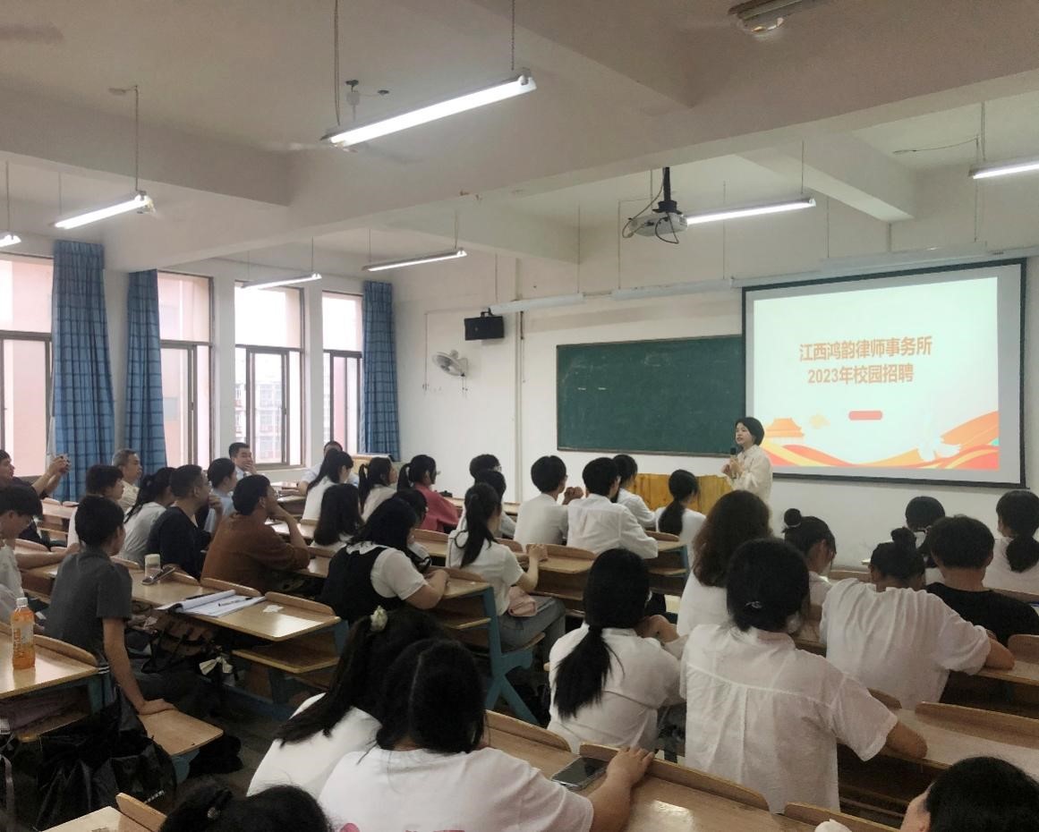首先由江西鸿韵律师事务所袁小红律师进行宣传,大致讲解了法学毕业生的就业方向,以及就业选择,说到什么样的人适合什么样的岗位,并且鼓励毕业生们积极就业。随后,由江西鸿韵律师事务所施远涛律师进行宣传,讲解了其律所的基本情况,有保障的基本薪资和优厚的绩效酬金,坚强的团队和丰富的案源供给,不设天花板,开放的合伙人制度,其后对招聘人才要求进行解说,并鼓励永利官网法学生毕业生积极向其所投放简历。