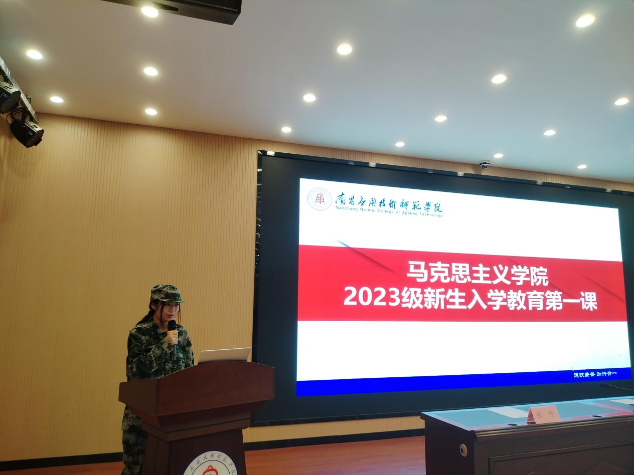 而后,新生代表、法学专业23级1班辛小鹏上台发言。她表述了相遇在南昌英雄城的欢喜,也分享了来应师院求学的喜悦,对学校(院)领导、辅导员及教官致以最诚挚的问候;