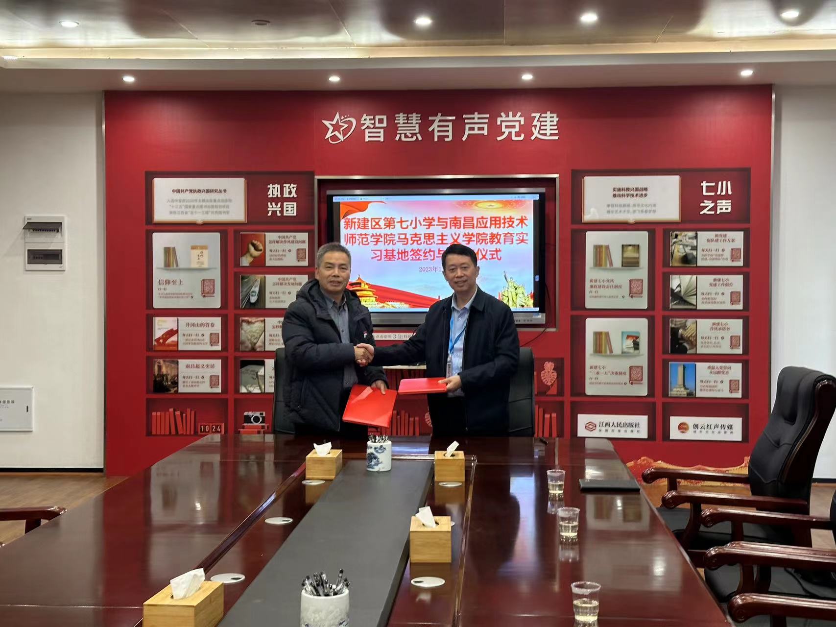 院长文道贵介绍了学院的基本情况及办学特色,并指出实习实训是学生接触社会工作实际,锻炼实践能力的重要手段,也是应用型本科高校培养高素质人才的重要实践教学环节。他表示,与新建区第七小学建立教育实习基地有助于思想政治教育专业学生明确发展方向,希望未来双方互相交流学习,在多个方面开展深入合作,真正发挥教育实习基地的育人作用。