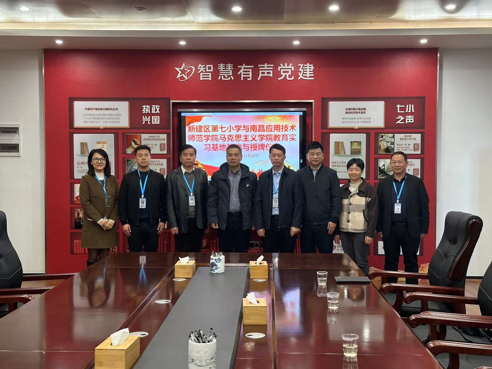 11月20日,yl6809永利官网yl6809永利官网与新建区第七小学合作共建实践教学基地签约暨授牌仪式在新建区第七小学举行。新建区第七小学校长邓必高、校党支部书记张兹巍、副校长邓勇、副校长佘春花、工会主席谭庆春;yl6809永利官网院长文道贵、党总支书记张欣康、副院长张丹、组织员吴昱杉参与授牌仪式。