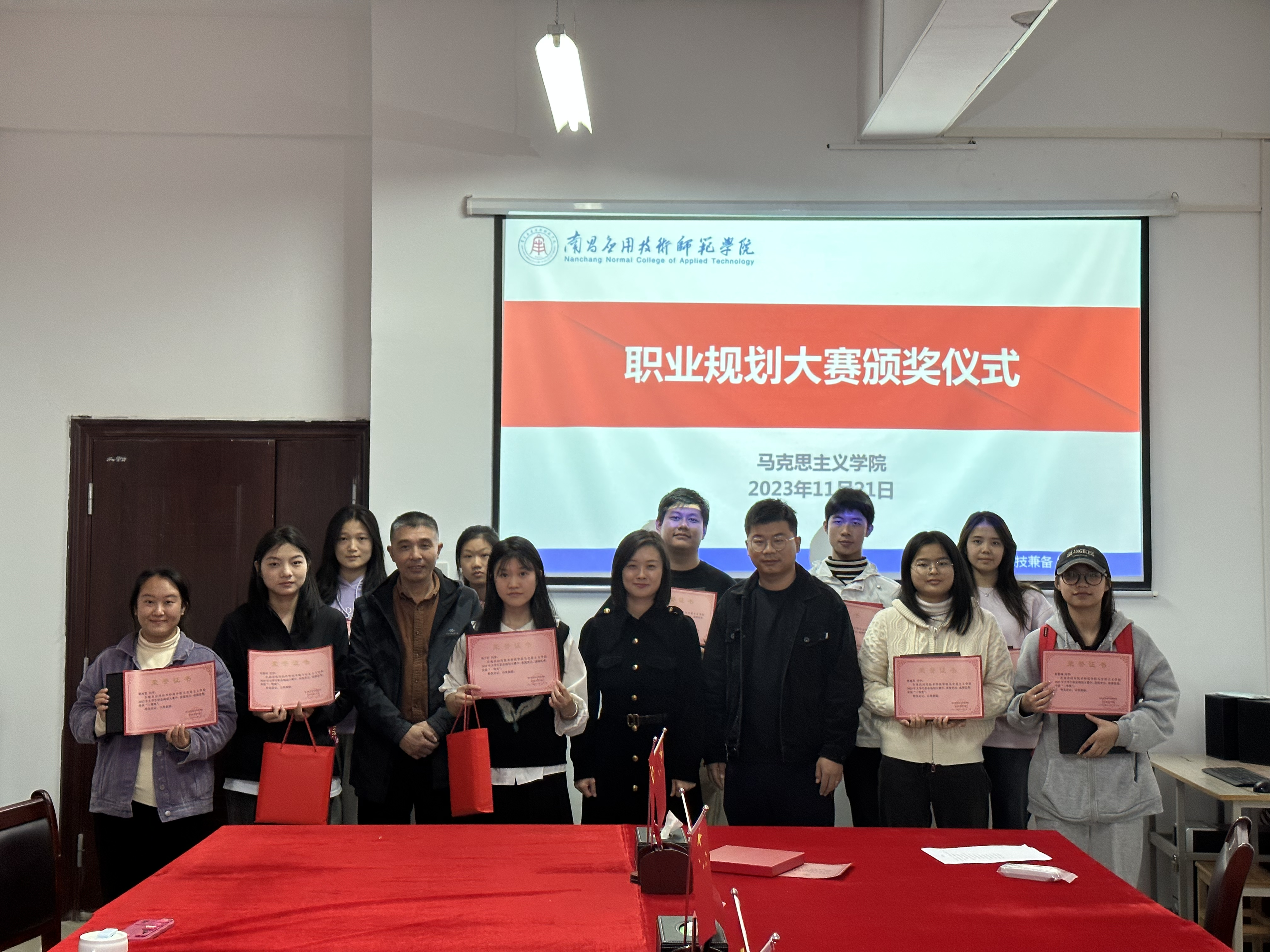 经评委统分后决定,一等奖两名,二等奖四名,三等奖五名,由党总支书记张欣康和党总支副书记李婷为获奖同学颁奖。