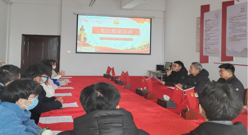 为进一步提高全体师生法律意识,引导学生深入了解宪法、尊崇宪法精神,增强法治观念,推动校园法治文化建设,yl6809永利官网于2023年12月4日上午9:30在1511会议室组织开展了“宪法晨读”活动,活动由法学教研室主任李水根主持,院长文道贵、党总支书记张欣康、党总支副书记李婷、副院长张丹、法学教研室部分专任老师以及法学班20名学生参加。
