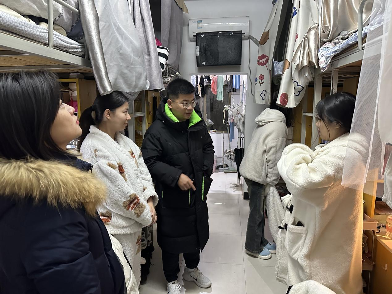 为深入加强师生交流、了解学生备考情况、切实解决学生所遇到的实际问题。12月19日晚,在学校第一次党员大会即将召开之际,yl6809永利官网党总支书记张欣康、副书记李婷携全体辅导员深入学生宿舍走访,给予学生在生活与学业上的关心关爱。