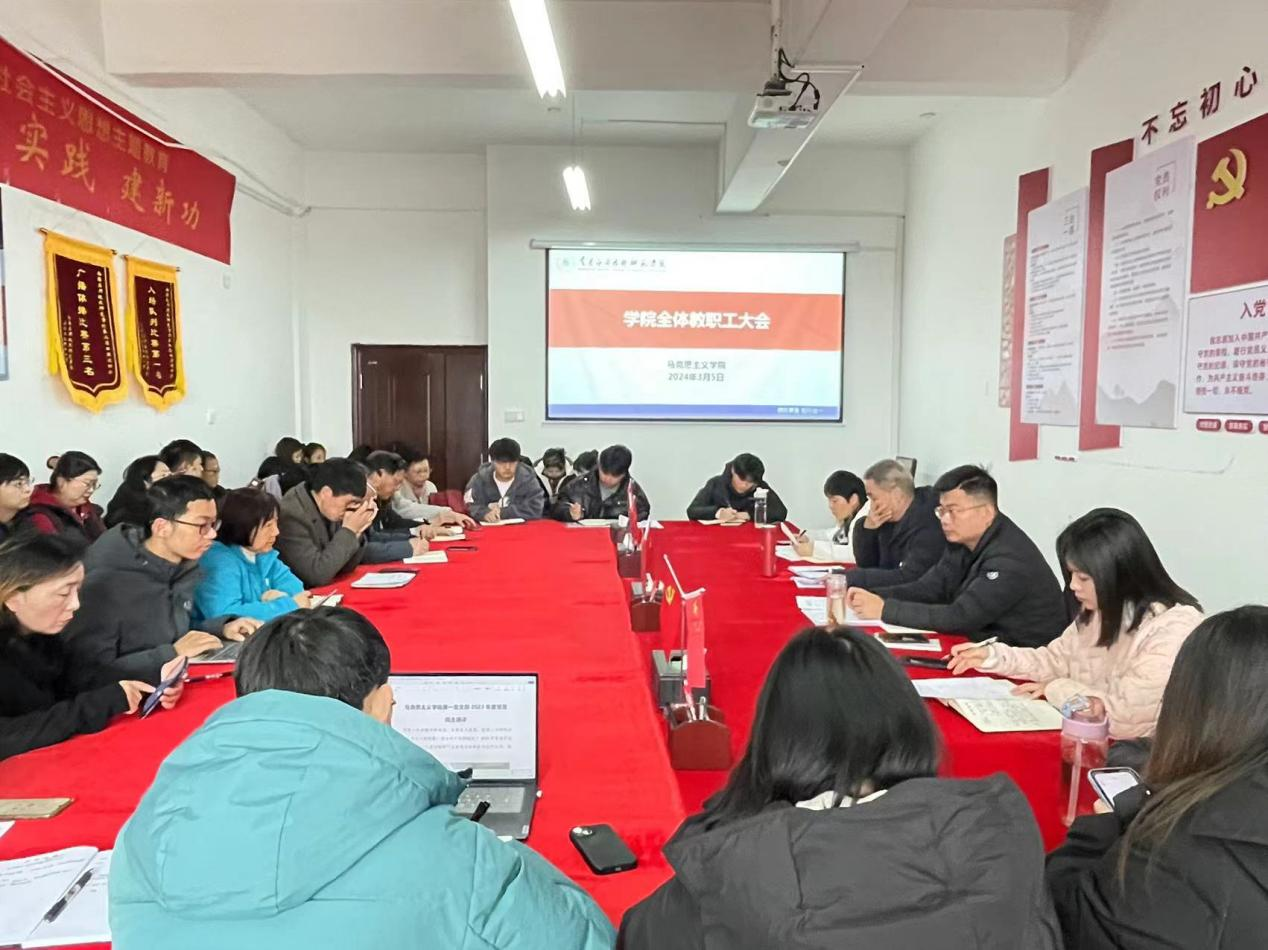 3月5日下午,学院在1511会议室召开2024年第二次全体教职工例会,院长文道贵,党总支书记张欣康,党总支副书记李婷、副院长张丹出席会议,学院全体教职工参加会议,院长文道贵主持会议。