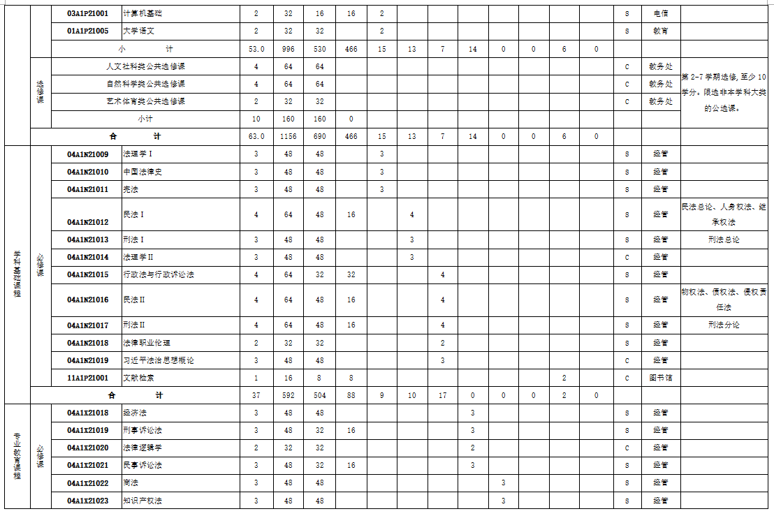 专业核心课程:法理学、中国法律史、宪法、刑法、民法、行政法与行政诉讼法、民事诉讼法、刑事诉讼法、法律职业道德、经济法、商法、国际法、国际私法、国际经济法、劳动法与社会保障法、环境与资源保护法、知识产权法。