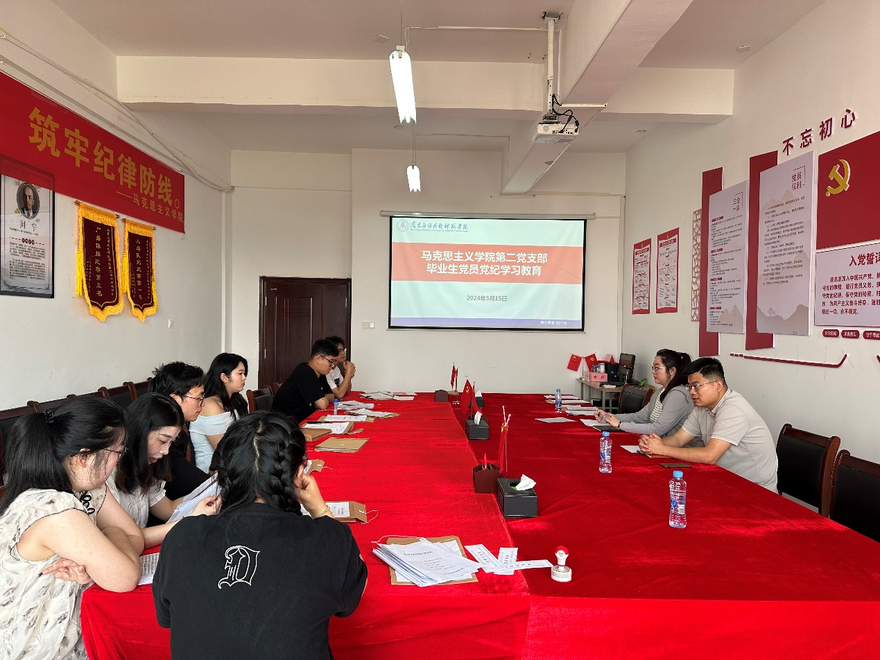 2024年5月15日,yl6809永利官网yl6809永利官网第二党支部在1511会议室针对即将毕业离校的党员开展党纪学习教育专题党课,党总支书记张欣康出席并讲话。支部书记吴昱杉授课。
