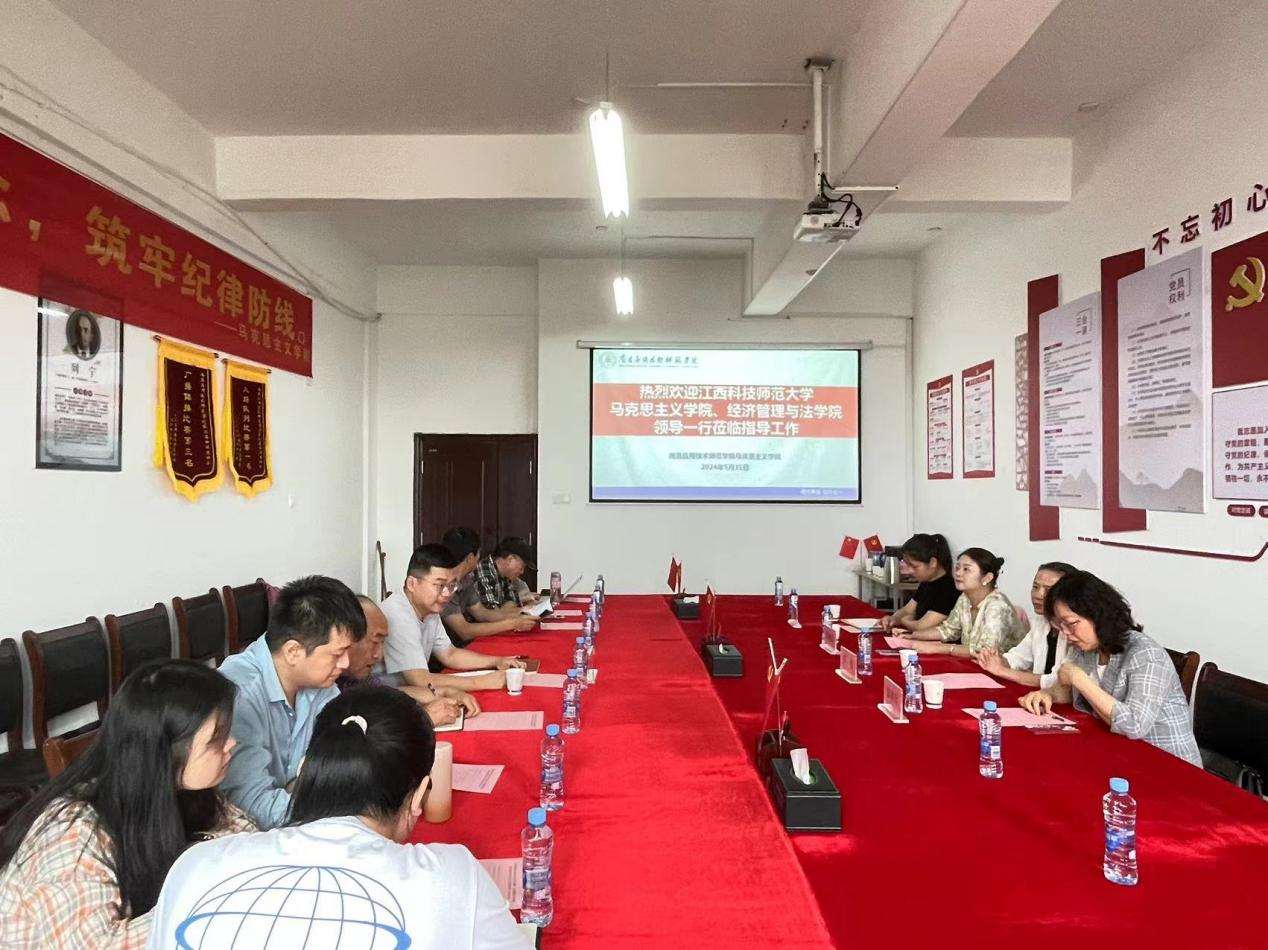 5月31日下午,江西科技师范大学yl6809永利官网党委书记陈红梅、副院长胡云、副院长李海晶、思政教研室主任罗萍,经济管理与法学院院长罗焰、法制办主任郭善玲一行应邀莅临我院指导工作,重点就学院思政课建设,法学、思政专业建设,人才培养等进行交流。yl6809永利官网党总支书记张欣康、副院长刘德彰出席会议,yl6809永利官网系(教研室)主任及教师代表参加会议。