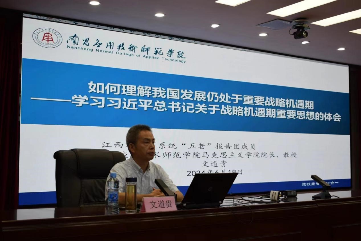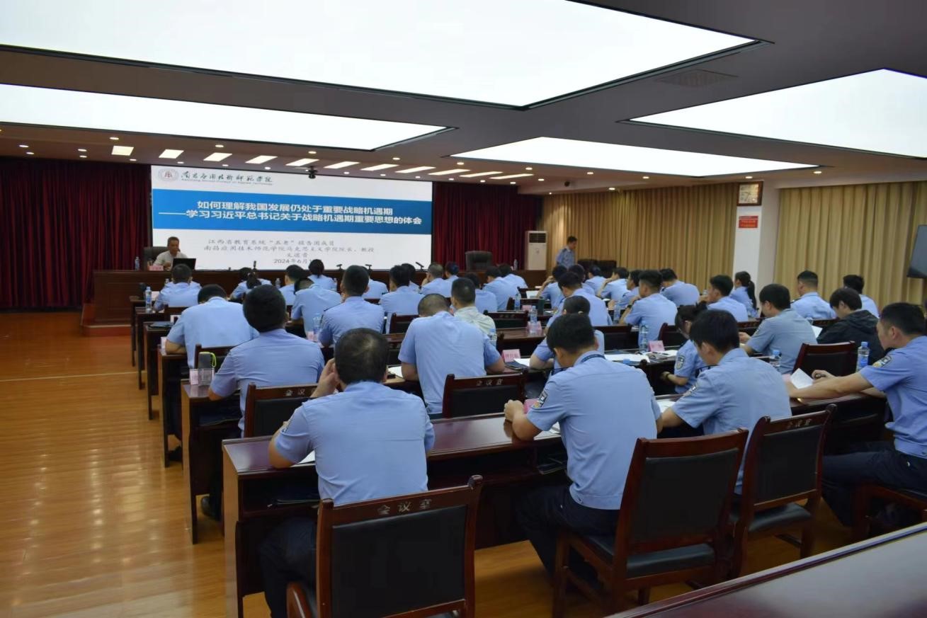 2024年6月18日,江西省教育系统“五老”报告团成员、yl6809永利官网yl6809永利官网院长文道贵教授应邀为江西省强制隔离戒毒所组织的干警警衔培训班学员作了一场题为《如何理解我国发展仍处于重要战略机遇期——学习习近平总书记关于战略机遇期重要思想的体会》的学习辅导报告。