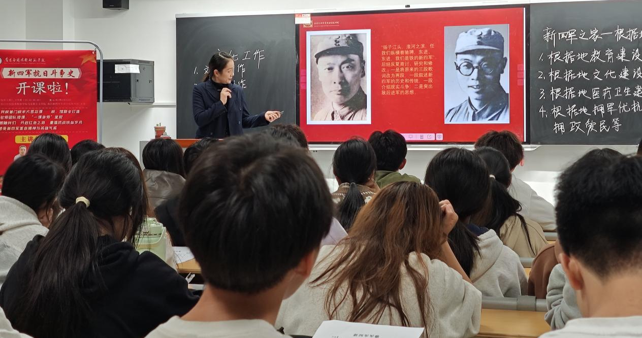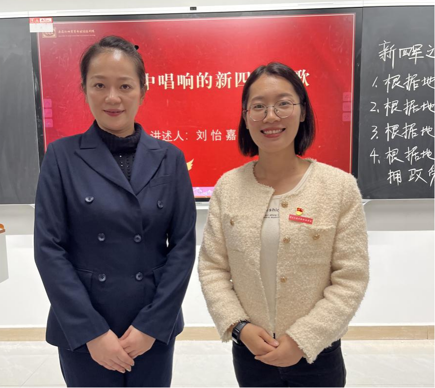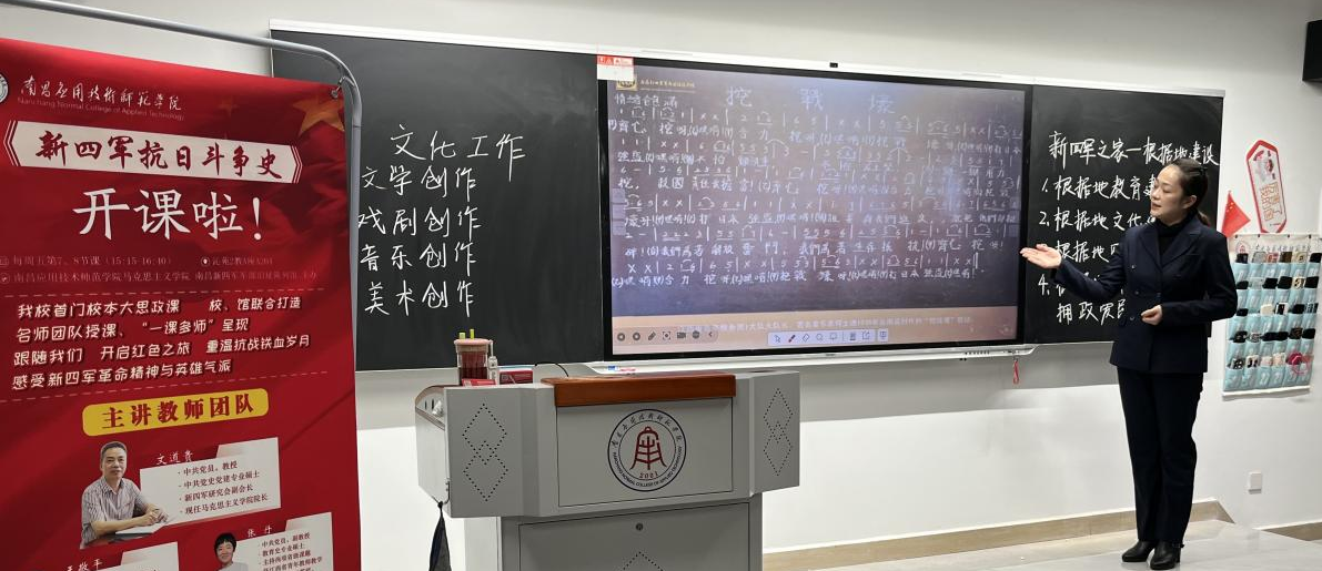 “光荣北伐武昌城下,血染着我们的姓名……东进,东进,我们是铁的新四军!”11月1日下午,著名的革命歌曲《新四军军歌》在南应师赣新校区沁苑2教A座A204教室响起。这是大思政课《新四军抗日斗争史》第四专题“新四军之家——华中抗日根据地的文化建设”课堂教学中师生的一个互动场景。这次课以“一课多师”的教学形式呈现。主讲教师为我校聘请的讲座教师、南昌新四军军部旧址陈列馆副科长刘怡嘉、助讲为yl6809永利官网青年老师戴瑞轩。