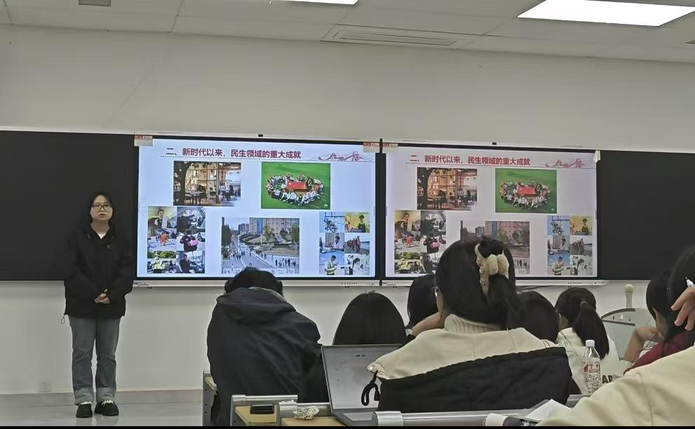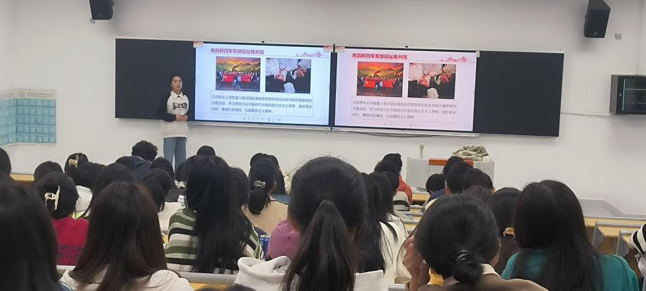 戴已晨同学多角度多方位讲解了多个生动鲜明、贴合实际的范例,如学校组织开展的井冈山爱国主义实践教学活动、新建县第五小学宣讲活动等实践活动的体验与回忆。向同学们展现了我校在文化强国及思政课实践上的努力。