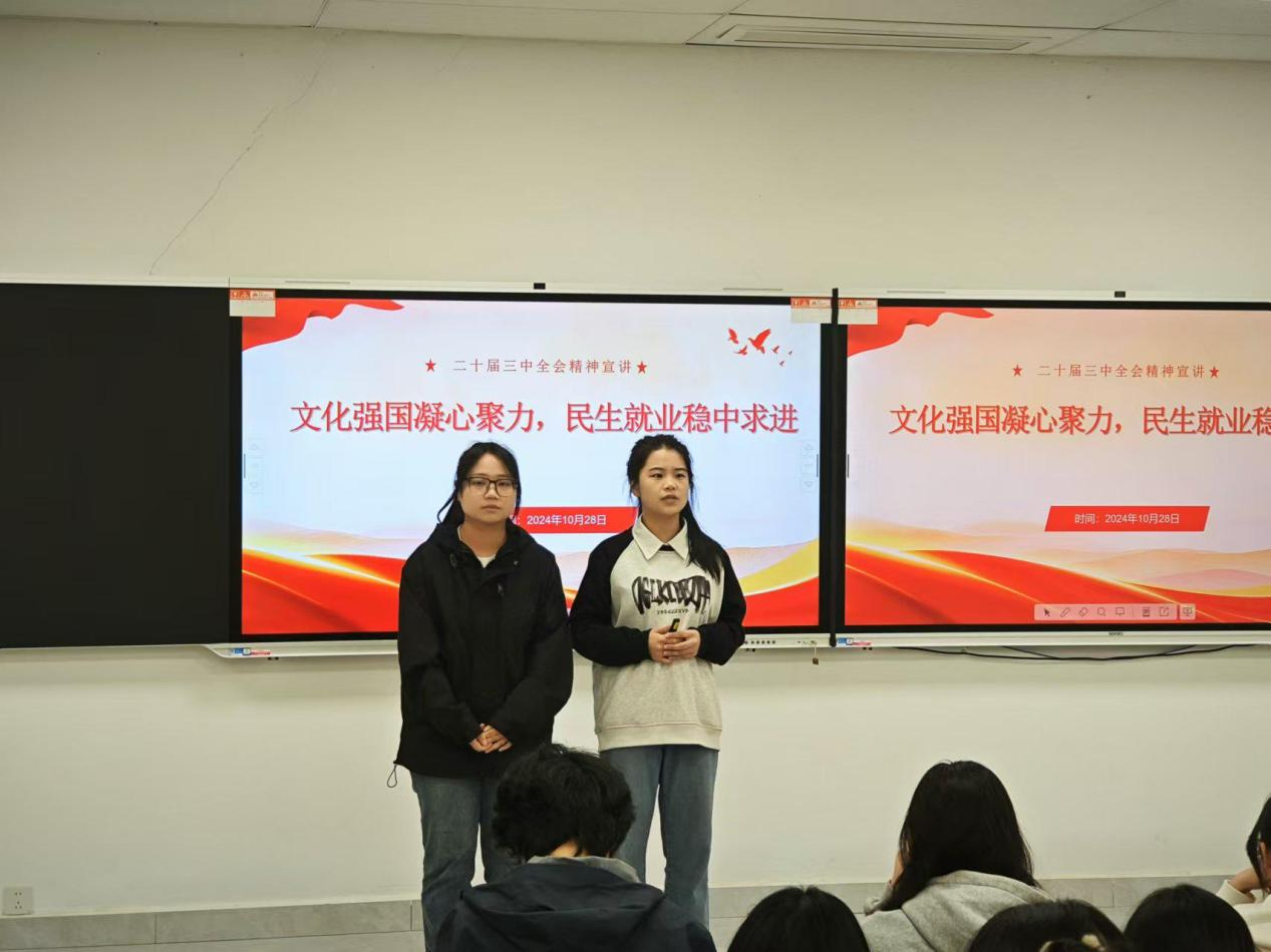 yl6809永利官网“星火宣讲团”在10月28日为2024级思想政治教育专业的同学们带来了一场以“文化强国凝心聚力,民生就业稳中求进”为主题的党的二十届三中全会精神宣讲。
