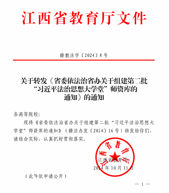 近日,江西省教育厅下发了《关于转发《省委依法治省办关于组建第二批“习近平法治思想大学堂”师资库的通知》(赣教法字〔2024〕8号)》的通知文件,确定了70位讲师入选全省第二批“习近平法治思想大学堂”师资库。永利官网副教授刘德彰成功入选。