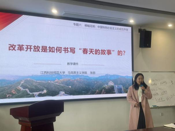 接着,省级教学成果奖获得者、江西科技师范大学马院张丽博士、青年教师郑青青分别以“改革开放是如何书写“春天的故事”的?”、“网络生活中的道德要求”为题讲授示范课。两位来访青年教师在备课准备、教学组织、AI技术手段融入课堂等环节,通过诗意的语言为我们生动地讲述了《习近平新时代中国特色社会主义思想概论》《思想道德修养与法治》精彩片段,通过主题讨论、数据分析、随堂训练、与人工智能对话等多种教学手段,为永利官网老师带来了一场充满互动与创新的课堂体验。