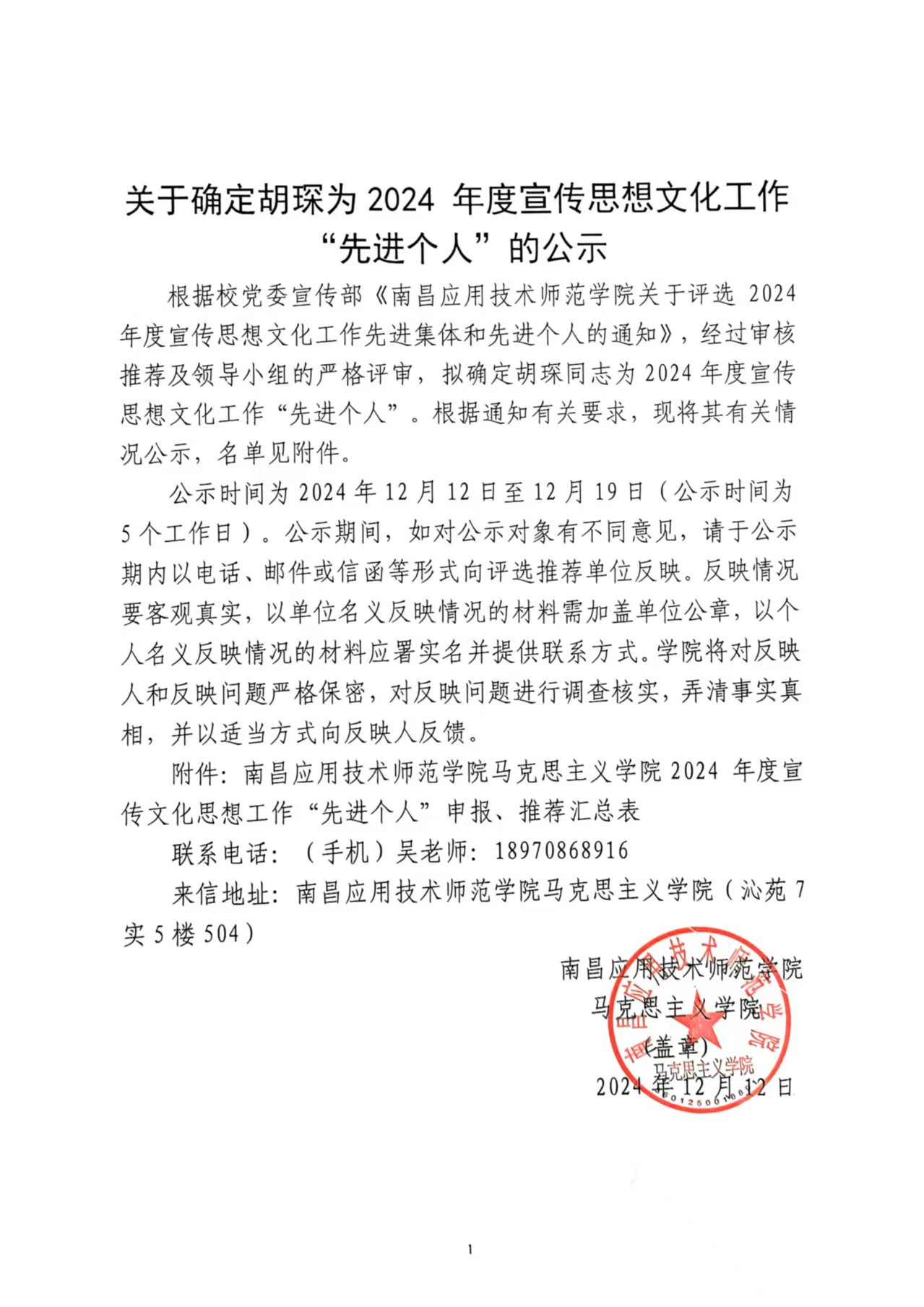 首页栏目 通知公告 学院新闻 习近平思想学习专栏 主题教育学习 院长书记信箱 您现在的位置是:首页 > 首页栏目 > 通知公告 关于确定胡琛为2024 年度宣传思想文化工作 “先进个人”的公示 学生科2024-12-122211 上一篇 关于拟将幸修丽、曹芮晨、徐雨婷、方伟思同志转为正式党员的公示 下一篇 2023-2024学年第一学期奖学金公示名单
