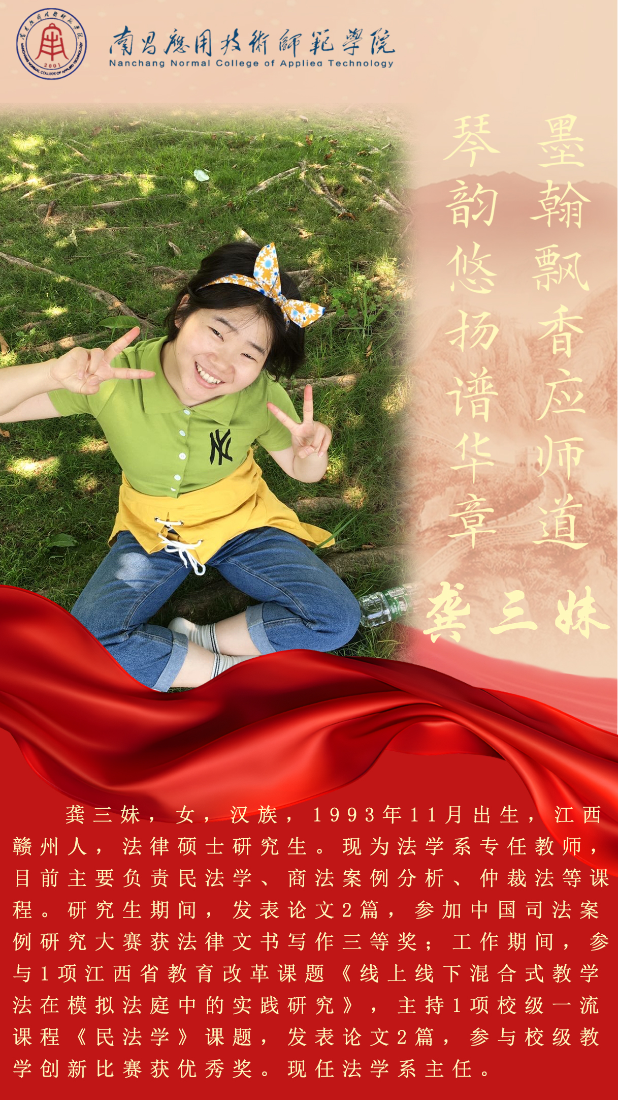 先进典型 优秀毕业生 优秀在校生 优秀教职工 您现在的位置是:首页 > 先进典型 > 优秀教职工 龚三妹 法学系主任 管理员2025-06-09583 上一篇 李婷 思想政治教育公共课系主任 下一篇 戴瑞轩 思想政治教育系主任