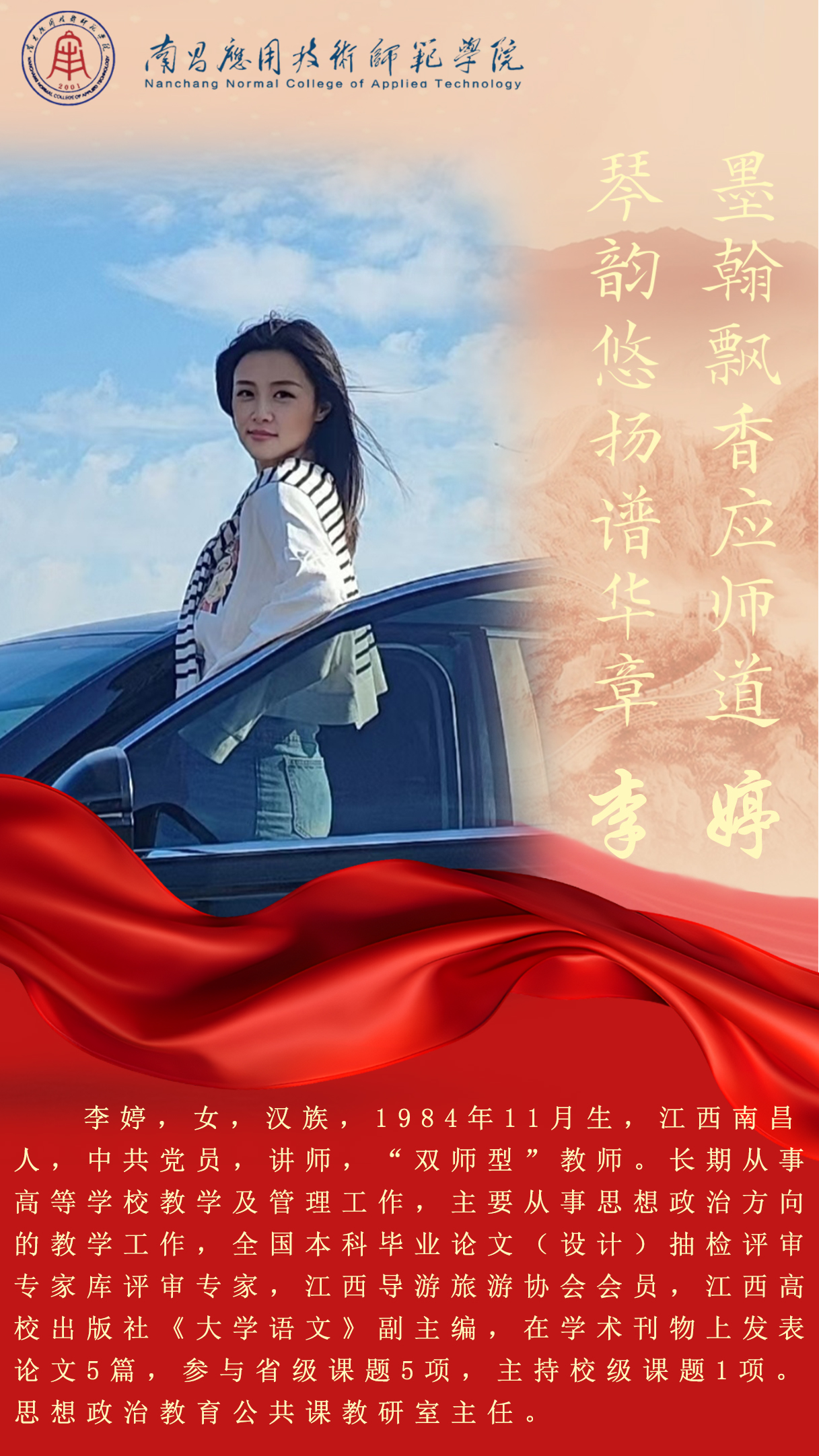 先进典型 优秀毕业生 优秀在校生 优秀教职工 您现在的位置是:首页 > 先进典型 > 优秀教职工 李婷 思想政治教育公共课系主任 管理员2025-06-09573 上一篇 杨志明 习近平新时代中国特色社会主义思想概论系主任 下一篇 龚三妹 法学系主任