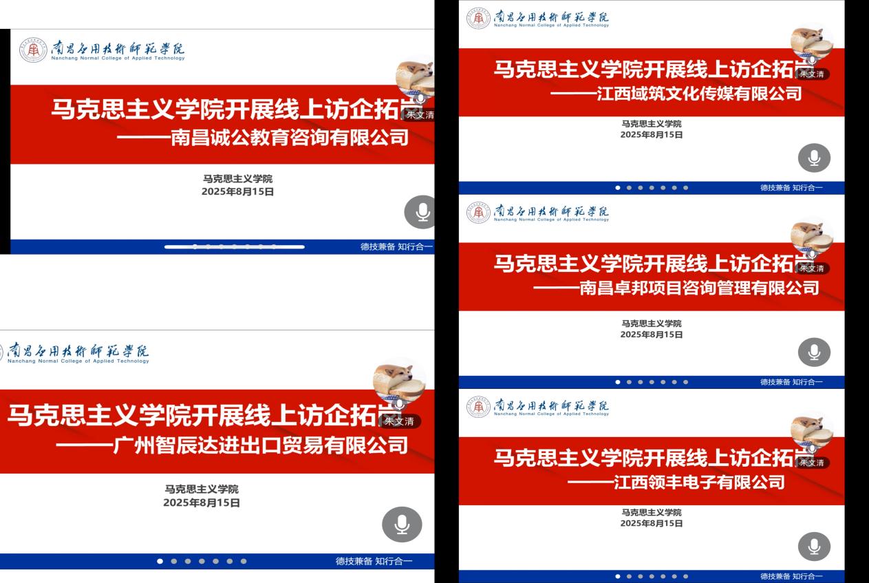 为拓宽毕业生就业渠道,强化校企合作,给学生提供更广阔的职业发展空间,8月15日,yl6809永利官网党总支书记张欣康通过视频形式对南昌诚公教育咨询有限公司、广州智辰达进出口贸易有限公司、江西域筑文化传媒有限公司、南昌卓邦项目咨询管理有限公司、江西领丰电子有限公司进行访问,双方就人才培养、实习实训、就业指导等方面进行了深入交流,并达成了一系列合作意向。
