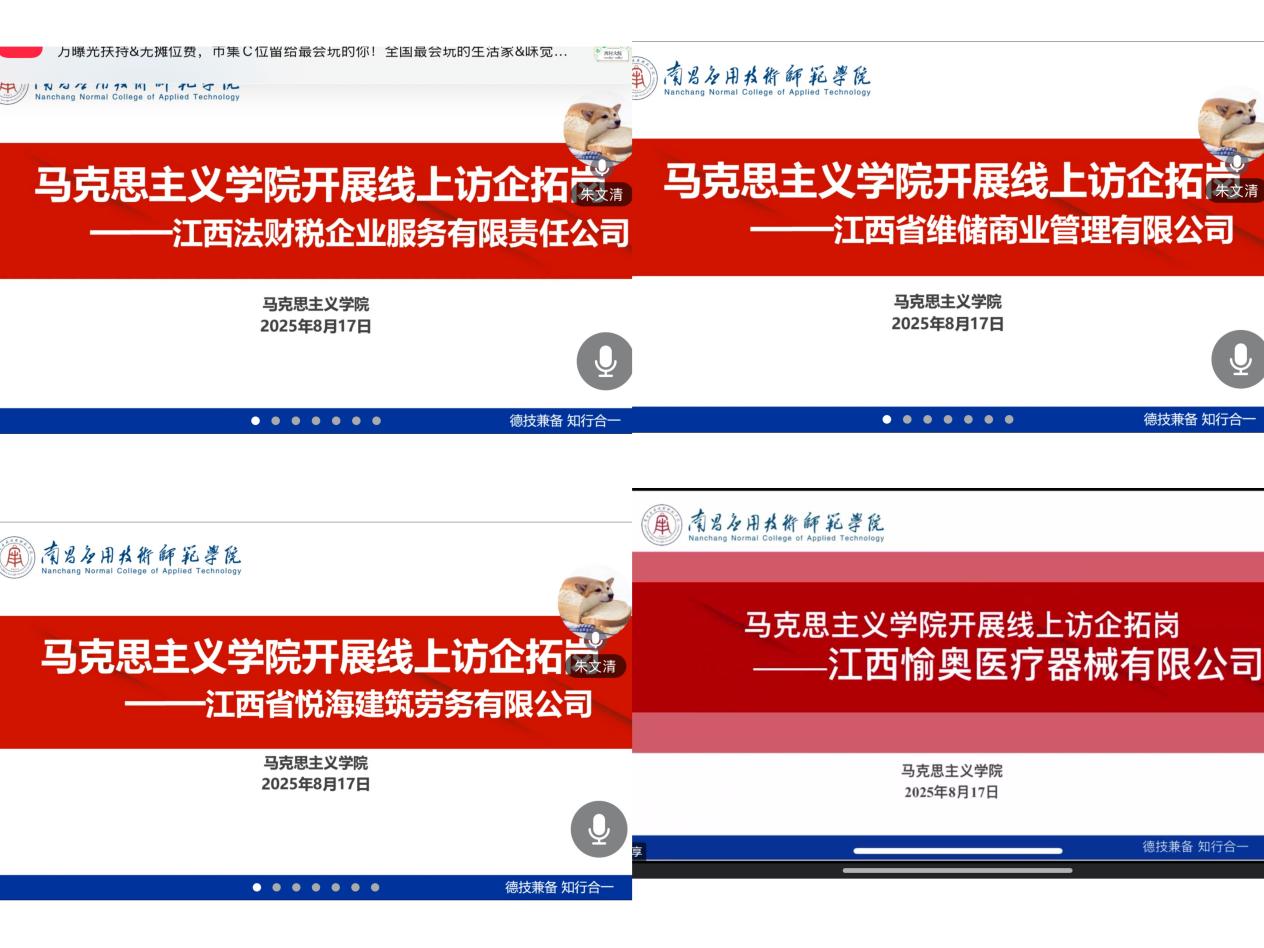 2025年8月17日上午,永利官网与江西法财税企业服务有限责任公司、江西省维储商业管理有限公司、江西省悦海建筑劳务有限公司、江西愉奥医疗器械有限公司开展校企合作,洽谈会在腾讯会议举行。永利官网党总支书记张欣康,企业领导参加会议,会议由朱文清主持。
